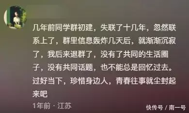 “几年前同学群初建,失联了十几年,忽然联系上了,群里信息轰炸几天后,就渐渐沉寂了,我后来退群了,没有了共同的生活圈子,没有共同话题,也不能总是回忆过去。过好当下,珍惜身边人,青春往事就尘封起来吧。”