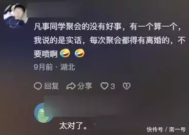 还有网友写道:“凡是同学聚会没有好事,有一个算一个,每次聚会都得有离婚的。”