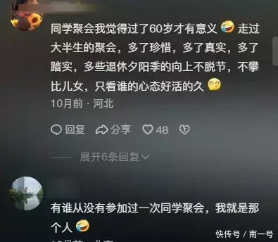 还有人认为同学聚会过岁才有意义,走过了大半生的聚会,多了珍惜,多了真实,多了踏实,不脱节,不攀比儿女。